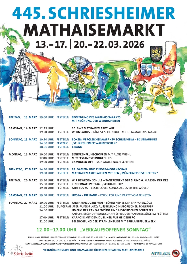 Wieder ist ein Jahr vergangen und wir feiern den 445. Mathaisemarkt – das erste große Wein- und Frühlingsfest der Region. Vom 13. bis 17. März sowie vom 20. bis 22. März wird es rund um den Festplatz in Schriesheim wieder ein spannendes und abwechslungsreiches Programm geben. An allen Festtagen sind zahlreiche Veranstaltungen geplant, die den Mathaisemarkt 2026 zu einem unvergesslichen Erlebnis machen werden.